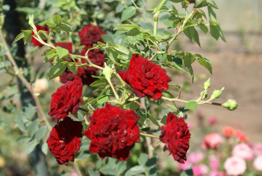 - Цветы: Мелкие, махровые, ярко-красного цвета, собраны в крупные соцветия.